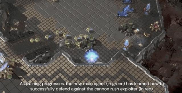 比如,蓝色是主要玩家,负责赢,红色是帮它成长的陪练。小红发现了一种cannonrush技能,小蓝没能抵挡住: