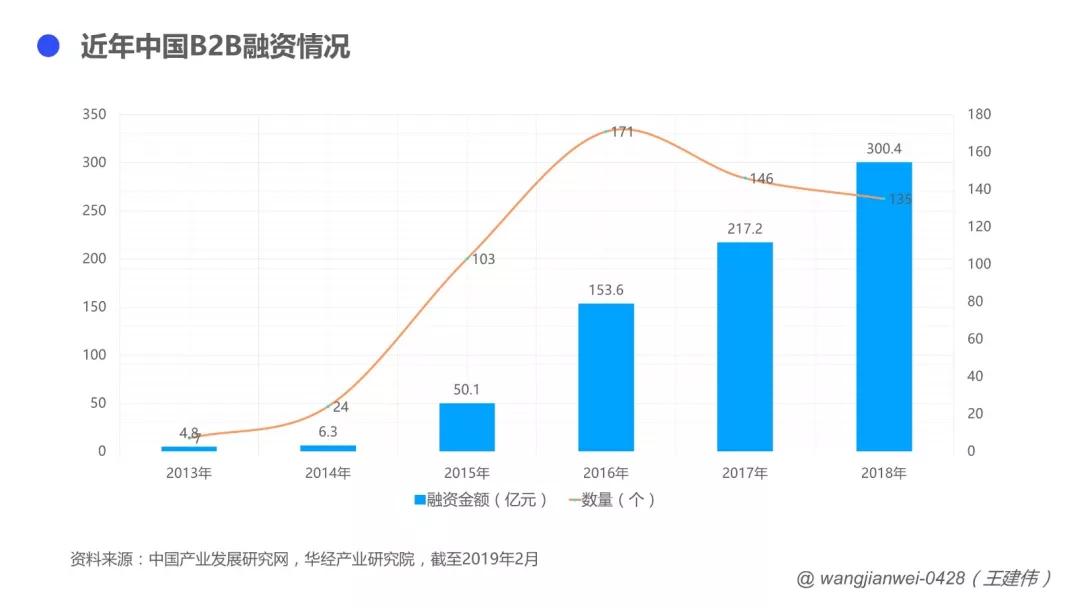 2015年被称为B2B市场的资本元年。B2B资本市场风起云涌,使得该领域各企业的融资金额不断被刷新。一方面,B2B电商获得融资的项目数量在2015年至2017年期间保持着连续增长的趋势,虽然2018年融资数量有所下降,但是融资金额增幅更高;另一方面,融资金额一直呈上升趋势,2018年出现了历史爆发性的增长。