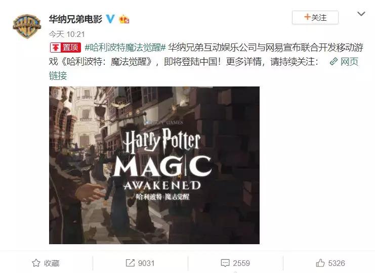 10月30日上午10点21分,微博号“华纳兄弟电影”宣布,其与网易游戏联合开发的移动游戏《哈利波特:魔法觉醒》即将登陆中国,在《哈利·波特》粉丝间引起了一场狂欢。