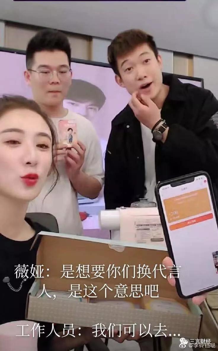10月30日,薇娅在直播中准备送粉丝邓伦的手办,而此时网友在直播间弹幕中评论称想要肖战或者王一博的。随后薇娅转头对品牌方称“是想让你们换代言人吧”,而该品牌方负责人则表示会去沟通。