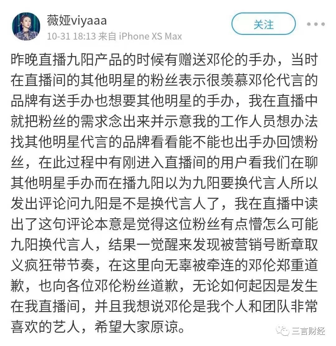 薇娅直播也翻车:提品牌“换代言人”惹怒邓伦粉丝,急道歉