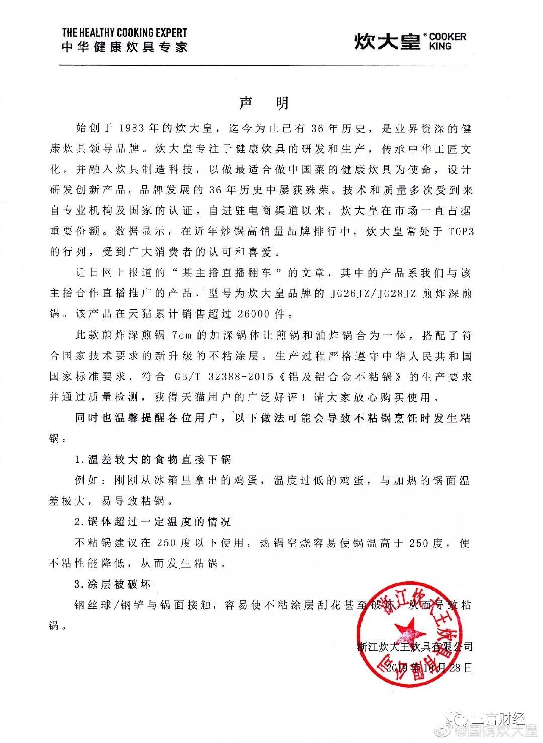 此前,李佳琦在直播售卖不粘锅“翻车”时也是如此,涉事品牌方发声明指出不粘锅实际上没有质量问题。