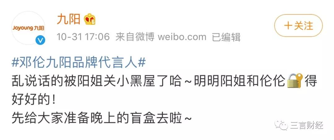 此次直播涉事品牌方是九阳,据悉邓伦自今年3月份成为九阳的代言人。九阳方面今日晚间发微博称乱说话的已经被“关小黑屋”,同时表示并没有替换代言人的打算。
