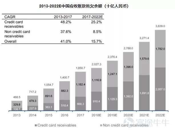 与此同时,源自信用卡消费的第三级应收款规模不断扩大,成为信用卡逾期款中占比最大的部分。根据艾瑞咨询的数据,第三级不良信用卡应收账款市场已从2013年底的104亿元人民币增至2018年底的2740亿元人民币,复合年增长率为92.4%,并有望继续以复合年增长率增长到2022E年底,这一比例为40.6%,达到人民币10,722亿元。