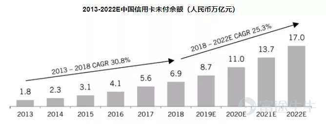 根据艾瑞咨询的数据,商业银行发行的未偿还信用卡余额一直是并且有望成为消费信贷市场增长最快的部分。中国信用卡市场的未偿余额总额从2013年底的人民币1.80万亿元增长到2018年底的人民币6.90万亿元,复合年增长率达到30.80%,并且预计将以复合年增长率继续增长25.30%达到人民币17.00万亿元。