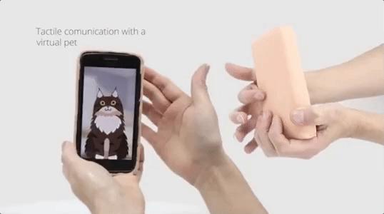 而抚摸人造皮肤“手机壳”时,手机屏幕上的小猫亲昵的眨眨眼、动了动耳朵,仿佛感受到了主人对它的爱抚。