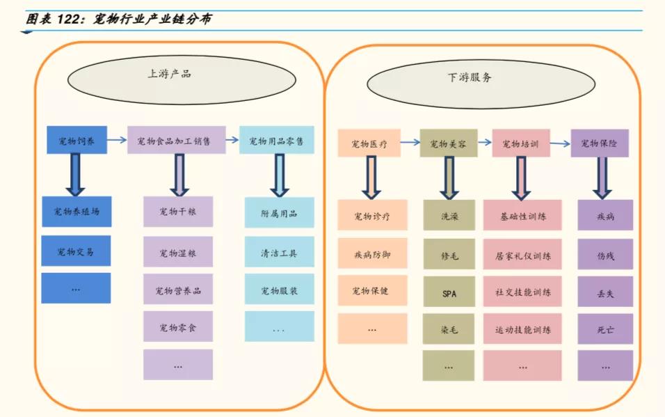 宠物行业经过多年的发展,已经形成了一个完整的产业产业链,覆盖宠物从生到死的全过程,上游包括宠护饲养、食品、日用品,下游有宠物医疗、美容、培训和保险等板块,其中宠物食品和宠物医疗是最大的两个板块。