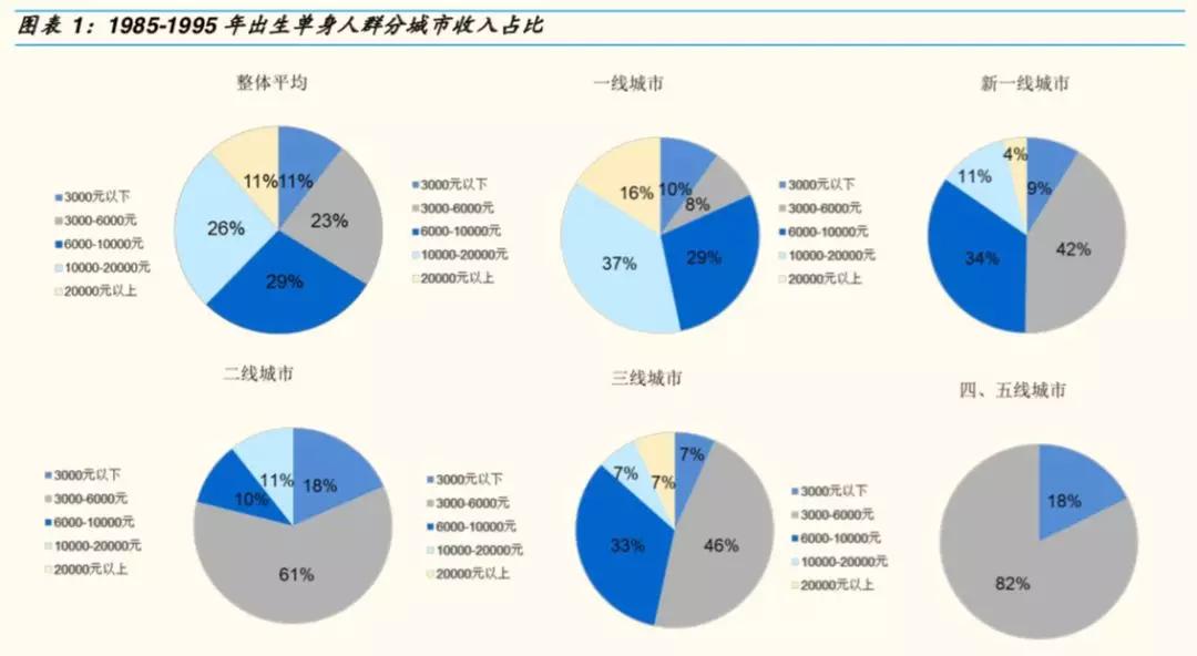 国金证券的报告显示,半数以上的单身青年集中在一线和新一线城市,其中互联网、汽车和房产行业是单身重镇。在一线、新一线、二线城市的单身青年,有40%是月光一族。总体85年至95年出生的单身人群中,52%的人群月收入在3,000~10,000元,新一线城市往下,部分单身青年的月度可支配收入在2,000到5,000元之间。