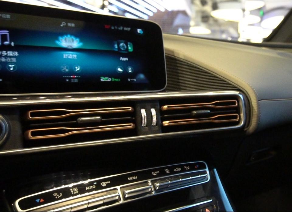 双10.25寸高清显示屏位于中控台中央,带有10种氛围主题的64色环境氛围照明系统,当车辆充电时,“呼吸功能”还可凭借车内氛围灯颜色的变化,提示驾乘者当前的充电状态。EQ风格配色座椅配有玫瑰金色缝线,空调出风口采用玫瑰金色钥匙形设计,内饰空间整体设计科技感十足。