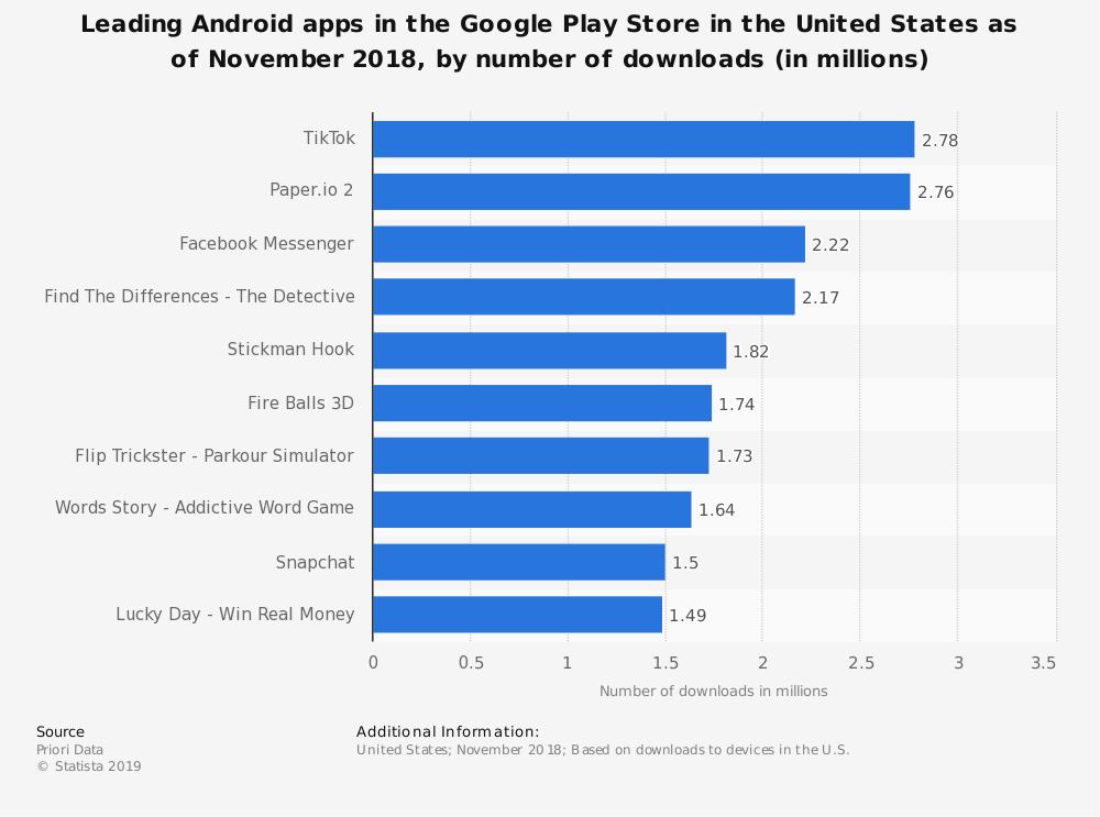 TikTok在安卓端上如鱼得水,其下载量是整个2018年苹果端下载量的许多倍。在美国,其在GooglePlay的下载量在第三到第四季度之间增长了70%,截至去年年底,TikTok已成为谷歌商店中的领先应用。