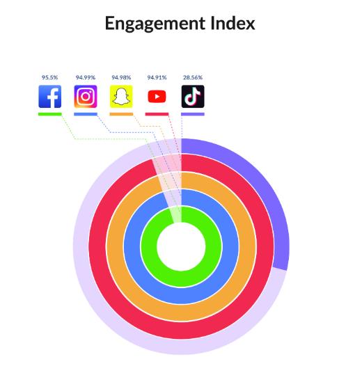 TikTok的用户参与度取决于月用户中每天打开应用程序的百分比,这一比例很低,只有29%。与其他社交媒体平台竞争对手相比,Facebook(96%)、Instagram(95%)和Snapchat(95%)的表现都明显更好。