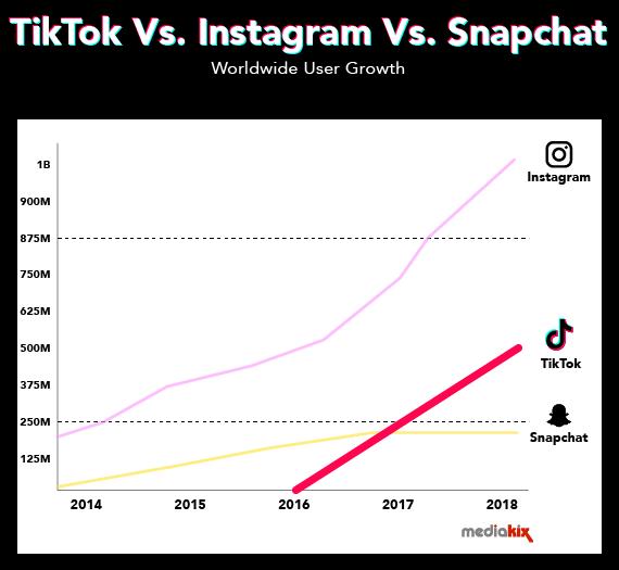 △Tik Tok与Instagram、Snapchat用户增长的对比