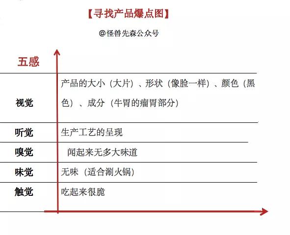 如,假设一个火锅品牌的主打菜是毛肚,我们就从五感的角度去分析毛肚的产品特征: