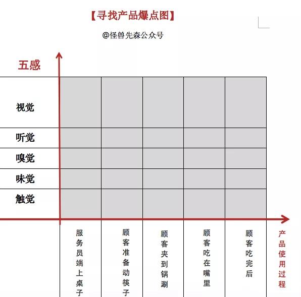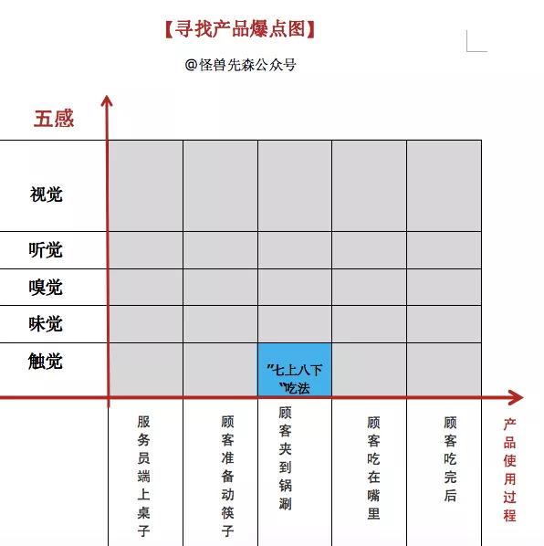 比如前面说的毛肚产品例子,结合纵轴五感角度的“视觉”和横纵的““服务员端上桌子”这两个角度的结合点,就可以做出”毛肚展开像脸一样大、端上来有喷雾“等产品体验,就容易引发顾客的主动分享。
