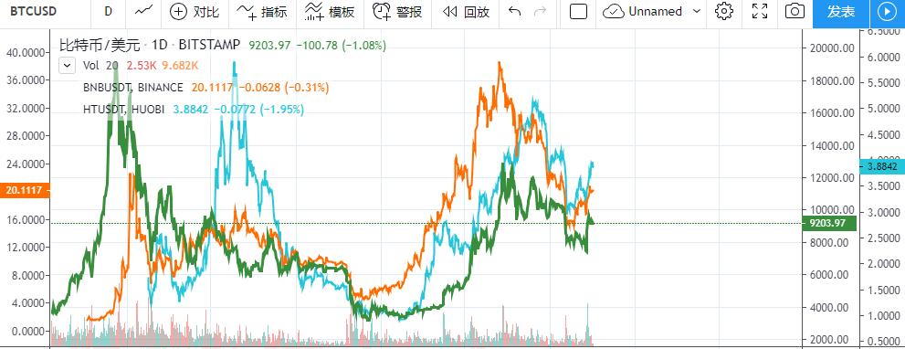 其中绿色线为BTC价格走势,橘色线为BNB价格走势,蓝色线为HT价格走势。