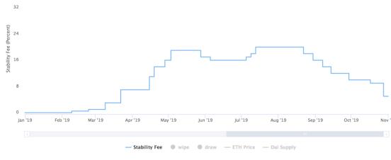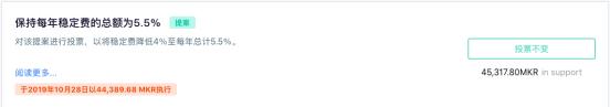 10月28日,MakerDAO官方发布消息,Dai稳定费率降低至5.5%.此提案在10月24日的电话会议中提出,截止10月28日以45,317.80 MKR的支持票得到执行。