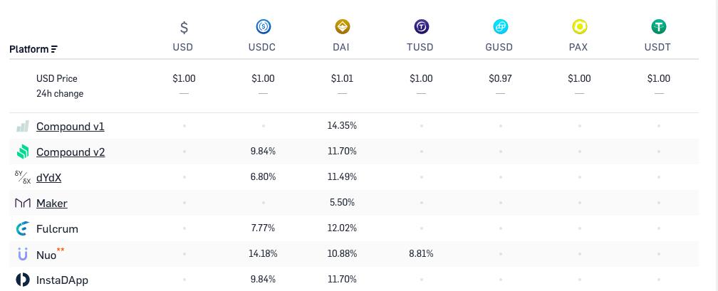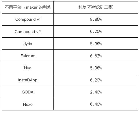比如,目前MakerDAO 的借出Dai的利率为5.5%,而Compound v1的借贷利率为14.35%、Compound v2的借贷利率为11.70%、dydx借贷利率为11.49%, 还有其他三个平台Fulcrum、Nuo、InstaDApp的借贷利率也都大于MakerDAO 的借出利率。如下图: