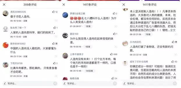 在互联网上,我们在人造肉相关新闻、文章或视频的下面都能看到人民群众的评价,部分人表示愿意尝鲜,但更多的是持中立或反对态度。毕竟一个入口的“新物种”,大家都会谨慎看待。