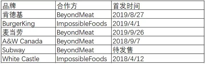 从上表中可以看出,人造肉产品除了在商超等零售场景与消费者见面外,耳熟能详的餐饮巨头们也陆续与人造肉领域的公司展开合作,并且已经有产品问世。