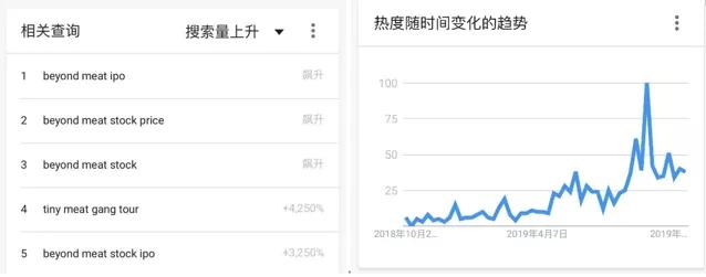 而BeyondMeat的热度并非仅在二级市场,在互联网上也一样火爆。GoogleTrends显示,在带有关键词“meat”的相关搜索里,各类主题和相关查询搜索最多的都是BeyondMeat的相关搜索。