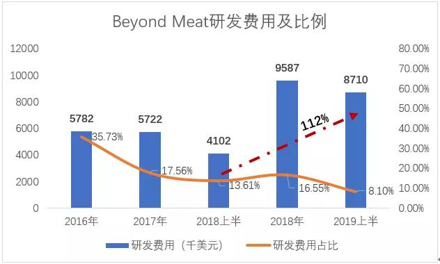 从研发费用看,BeyondMeat确实在研发上有持续投入,2019Q2研发费用较同比增长112%,而2018年研发费用全年接近千万美元。
