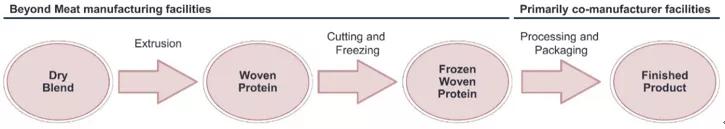 BeyondMeat招股书公布的生产流程比较简单,我们可以理解成植物蛋白的分离、挤压对应了“塑形”,而去腥(豆腥味)和融入类似纯肉的风味则是“调味”。