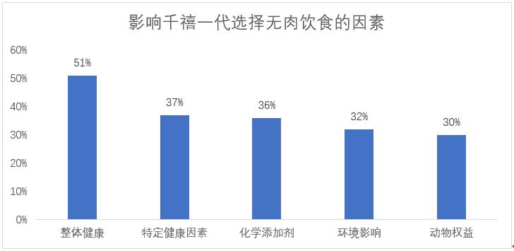 从美国的情况来看,千禧一代对无肉饮食的接受度很高,各种意识在驱动和改变消费者的消费习惯,主要影响因素以“追求健康”、“环境保护”、“动物保护”为主。