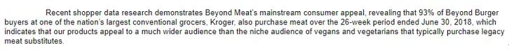 植物肉产品并非传统素质主义者的专利,根据BeyondMeat招股书中描述,其产品的消费者并不都是素食主义者或者Vegans,这些消费者中93%的人也同时消费纯肉类产品。
