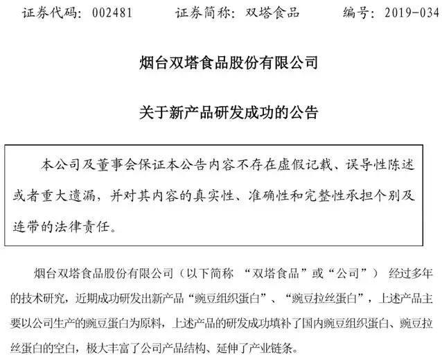 双塔食品(002481)股价在5月初BeyondMeat上市消息爆出来后,在6月6日发公告说明“公司经过多年的技术研究,近期成功研发出新产品“豌豆组织蛋白”、“豌豆拉丝蛋白”。”