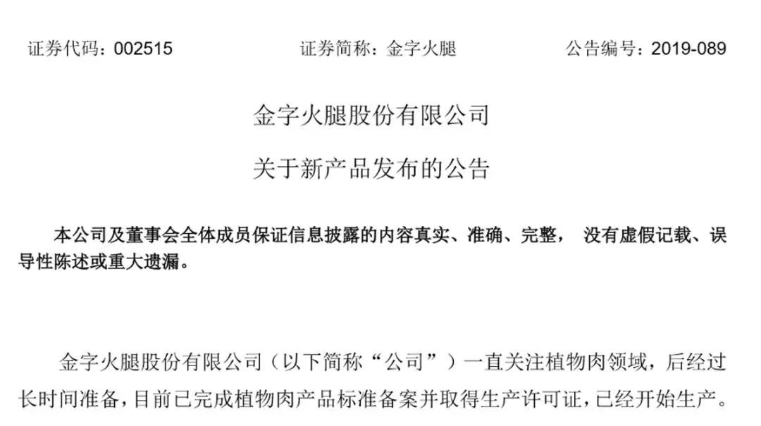 另一家最近在A股市场表现大热的上市公司是金字火腿(002515),在9月14日发出公告宣称公司的植物肉产品已经取得生产许可。