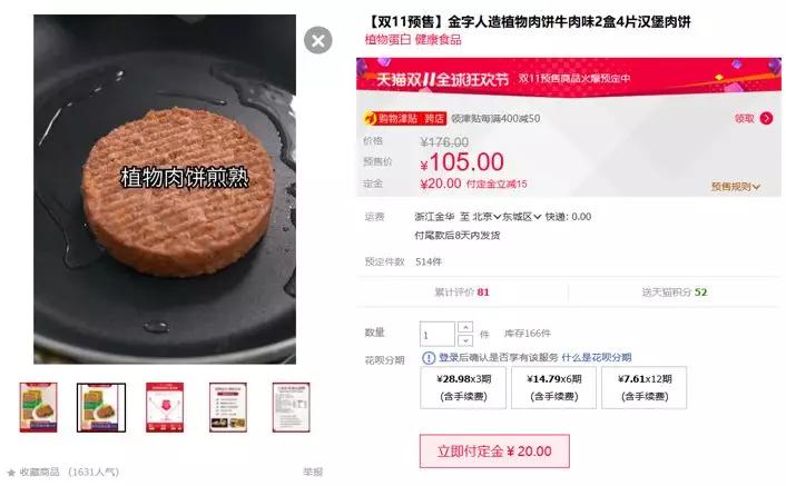 国内也陆续有人造肉产品的面世,深圳某餐厅售卖的人造肉汉堡,中秋节时上线的人造肉月饼,上市公司金字火腿推出的人造肉饼也在天猫旗舰店上架。