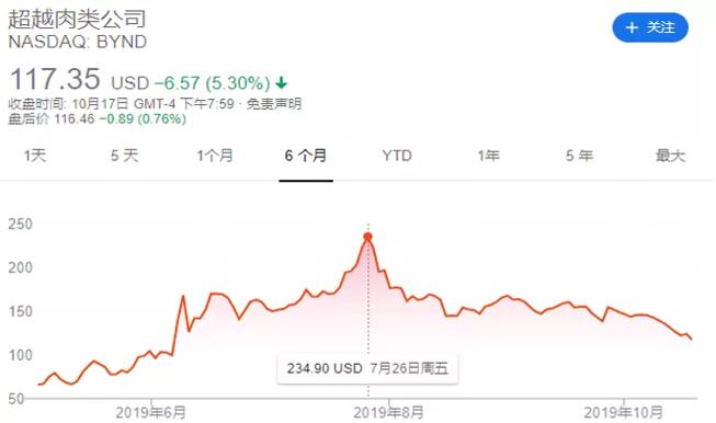 BeyondMeat2019年5月2日在纳斯达克挂牌当日,开盘价46美元,较发行价25美元溢价84%;股价收涨163%,至65.75美元,创金融危机以来最佳IPO首日表现。7月底最高时达到234.9美元,相较发行价翻了9.3倍。