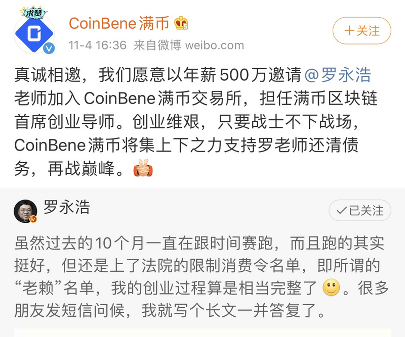 CoinBene满币官方微博则给出了更具体的价格,称:“真诚相邀,我们愿意以年薪500万邀请罗永浩老师加入CoinBene满币交易所,担任满币区块链首席创业导师。创业维艰,只要战士不下战场,CoinBene满币将集上下之力支持罗老师还清债务,再战巅峰。”