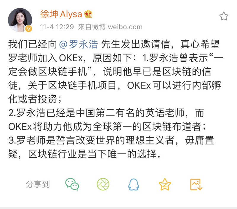 继续孙宇晨后,OKEx战略副总裁徐坤11月4日中午12时左右也发微博向罗永浩伸出了橄榄枝。