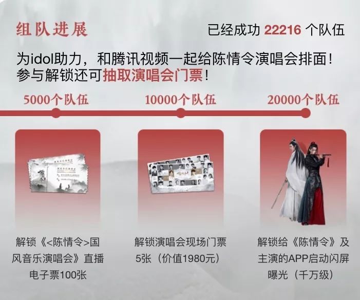 因为腾讯视频开通单月会员只需25元,所以多数网友选择晋升会员。为了尽可能激活消费,腾讯视频还推出了“陈情令主题曲K歌挑战赛”“分享活动抽送门票”“idol助力,给演唱会排面”的系列活动。其中助力活动有22216个队伍合作,意味着至少有10多万用户参与进来。