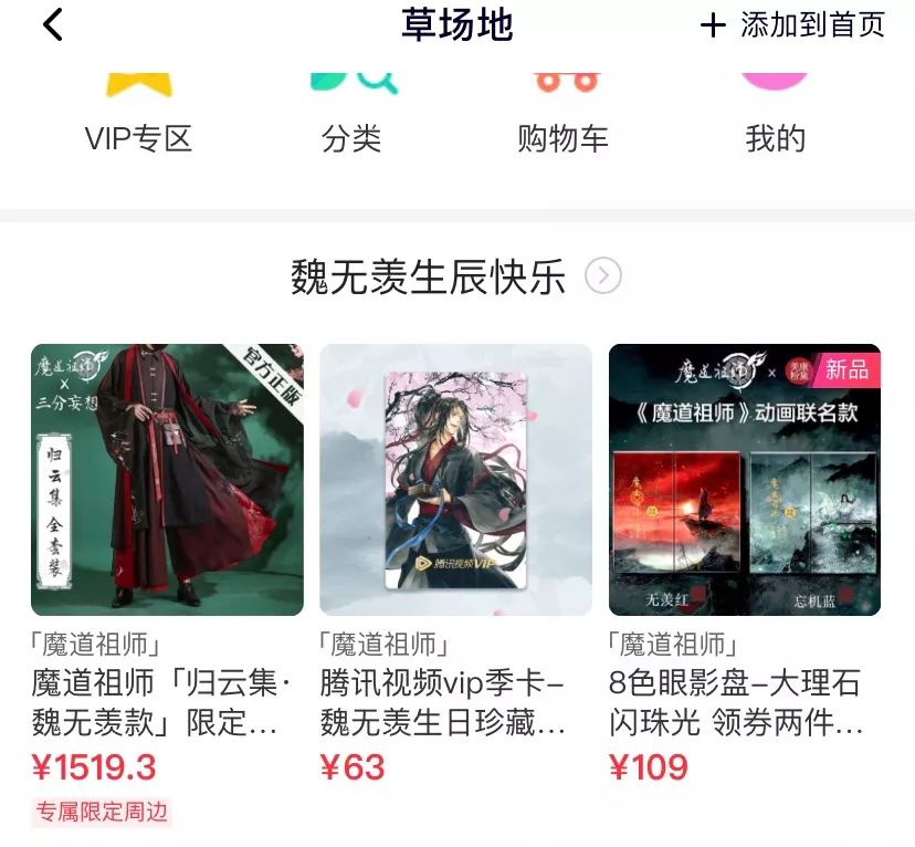 在腾讯视频的草场地,我们可以看到《魔道祖师》《哪吒》《陈情令》《复仇者联盟》的周边正在售卖,但整体生意惨淡。