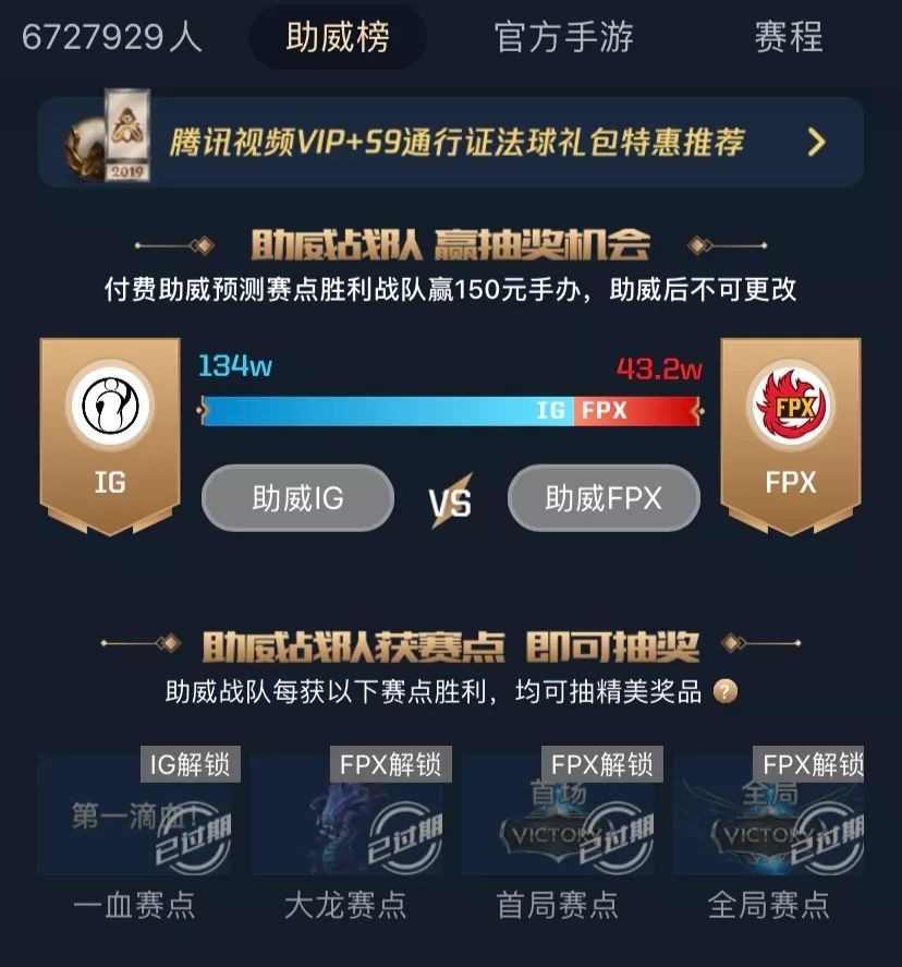 不过,已经有平台开始将打榜与付费结合。11月2日,硬糖君在腾讯看英雄联盟S9半决赛IG vs FPX直播时,视频下方弹出了“付费助威 赢抽奖机会”的游戏界面。