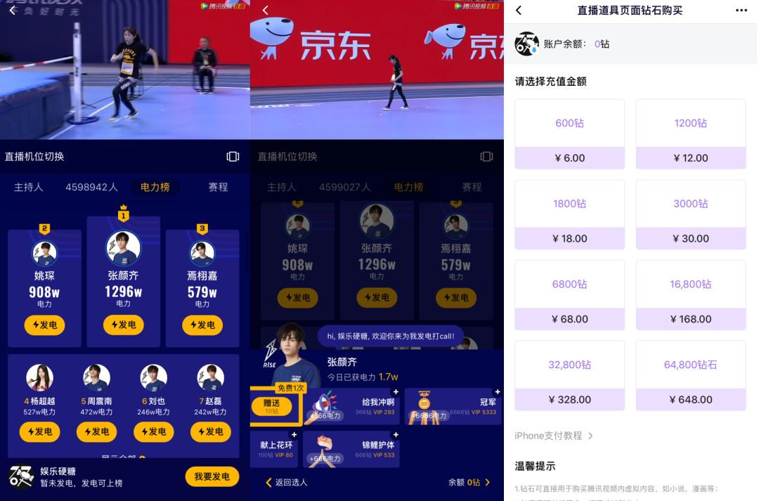 腾讯视频的《超新星全运会》,同样采取了电力榜游戏。和电竞赛事相比,这档聚集几十位偶像的节目粉丝参与度无疑更高。目前,张颜齐以1296万电力位于电力榜总榜首位,单人为平台贡献了近10万元收益。