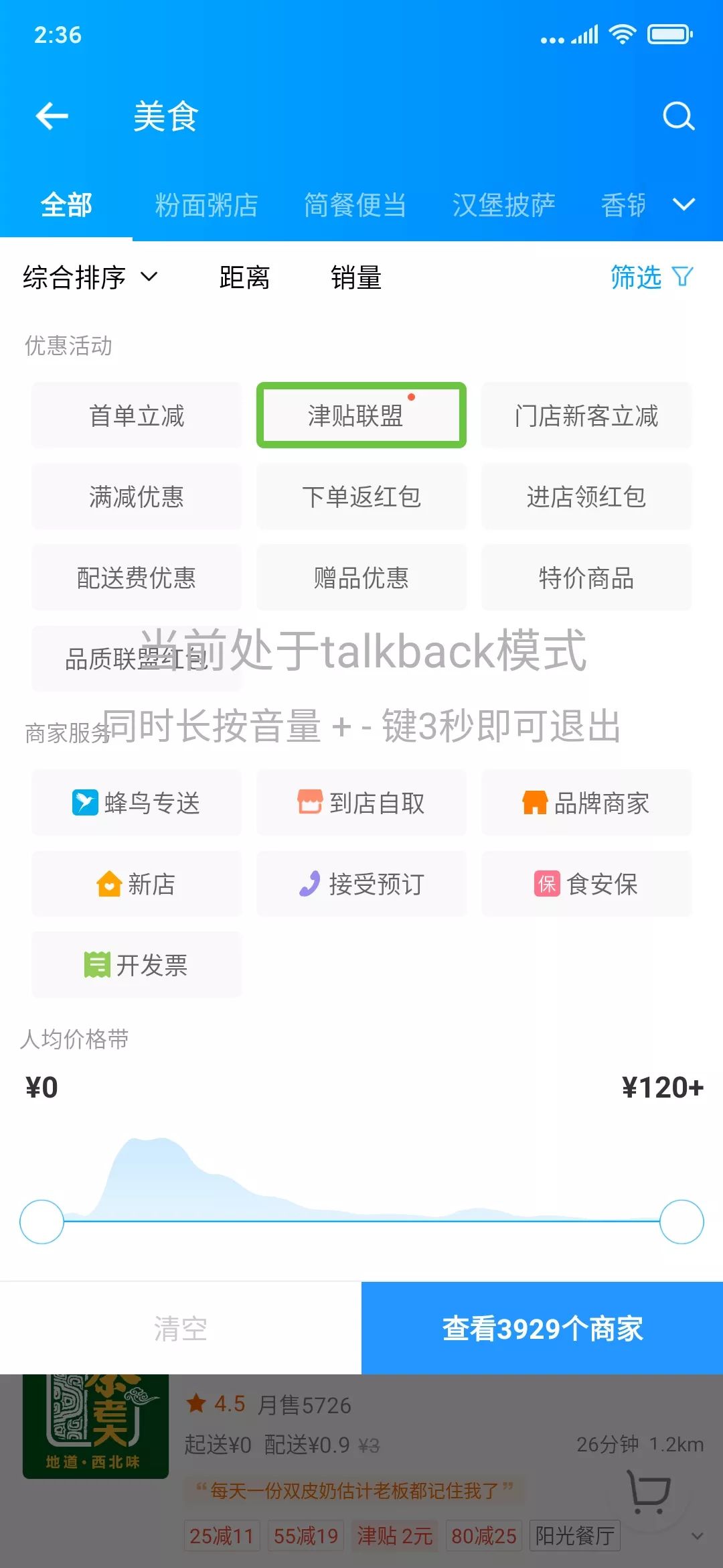 进入店铺列表,和美团一样可以读出每家店铺的信息,不一样的是,会把可用的红包金额和优惠,以及精选评价也一同读出。对难以直观看到的视障人士来说,明显更加便利。店铺筛选也做到了可以点击并读出,不过下放的图形化价格筛选无法读出或使用。