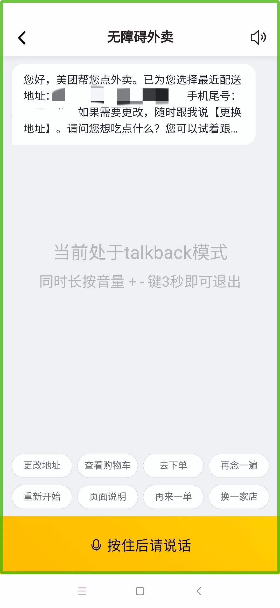 无障碍外卖界面设计清爽简洁,除了八个快捷按钮和说明文字之外,就只有按住说话的按钮。如果以普通人的眼光审视,这是个好看而且易用的设计,可实际上,根本不能在手机开启屏幕阅读器的前提下正常使用。