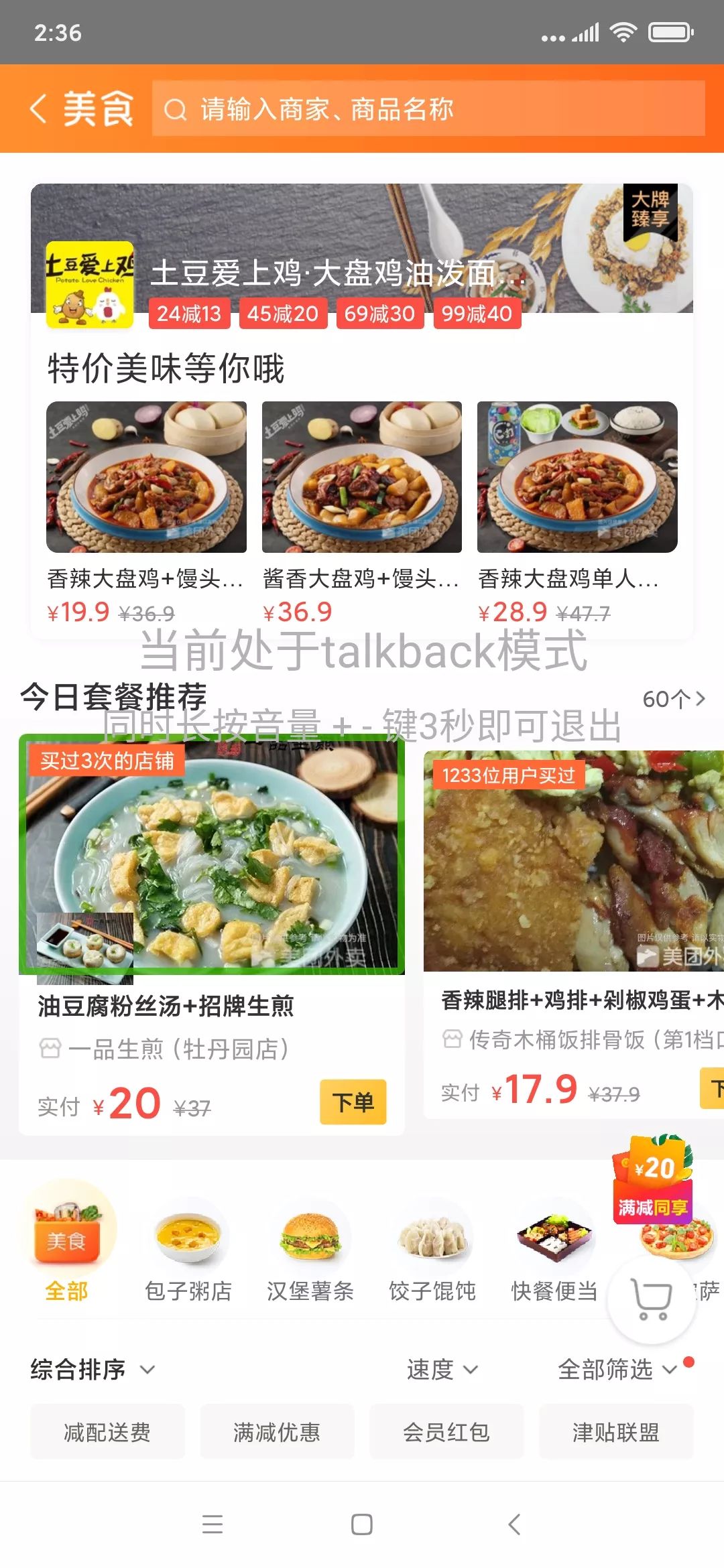 美团的各类界面都包含有不可读元素,以促销等活动图标为主。不过商家列表可以正常阅读,店名、评分、销量、配送时间距离、起送价、送餐费以及人均消费,都会在点击时一并读出来,减少了不必要的多次点击。