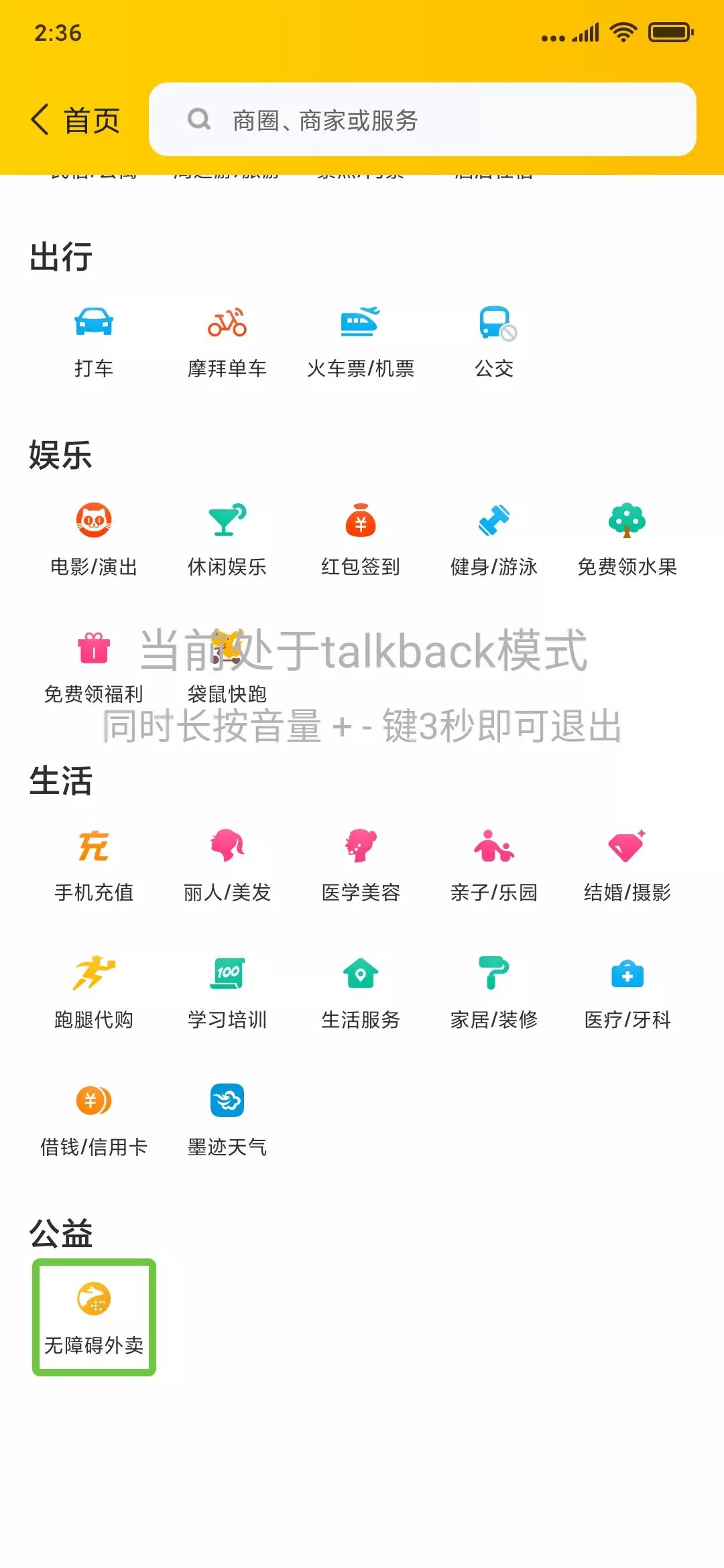 在美团的官方说法中,除了首页的麦克风按钮,还有“更多”页面最底部的无障碍外卖按钮可以进入无障碍外卖。这也是使用屏幕阅读器时,进入美团无障碍外卖唯一可行的办法。