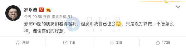 罗永浩婉拒币圈邀请:感谢好意,但发币我自己也会