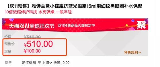 我们再来看下这些产品的价格都是多少,在我们查看这些商品的价格时,我们发现除了「P&G宝洁」的商品是已真实79元价格出售,其他的商品都是采取预交定金的策略,来进行直播销售。比如说「雅诗兰黛」的「蓝光眼霜」预售价是510,而在直播中采取的价格是交定金100元。