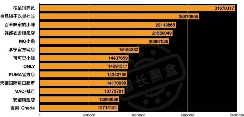 519位热门主播中,粉丝数排名前十的分别为松鼠饲养员(三只松鼠)、良品铺子吃货社长、百草味家的小味、韩都衣舍旗舰店、MG小象(女装品牌)、李宁官方网店、可可里小姐(女装品牌)、ONLY、PUMA官方店、天猫国际进口超市。