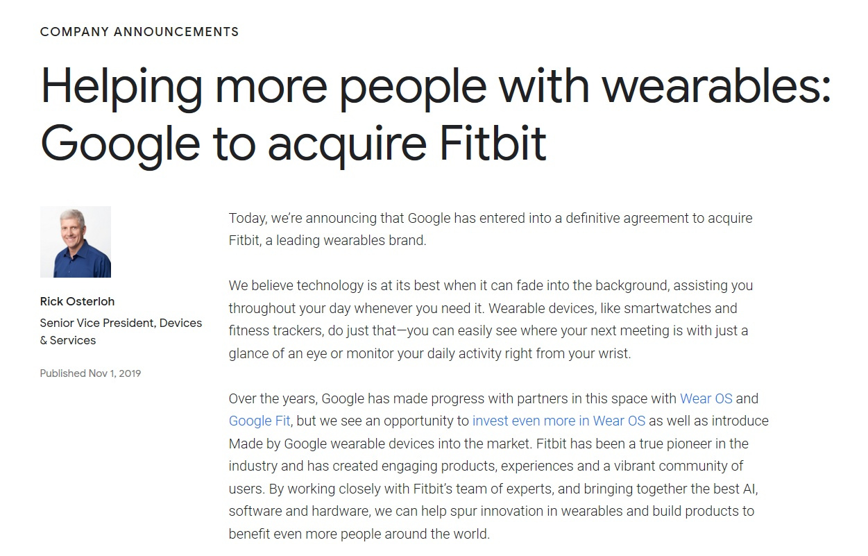 11月1日,谷歌宣布斥资21亿美元收购美国可穿戴设备制造商Fitbit。收购消息刚传出来,Fitbit公司的股价就立刻上涨了约17%,谷歌母公司Alphabet的股价上涨约0.6%。显然,市场对这一新组合是满意的。