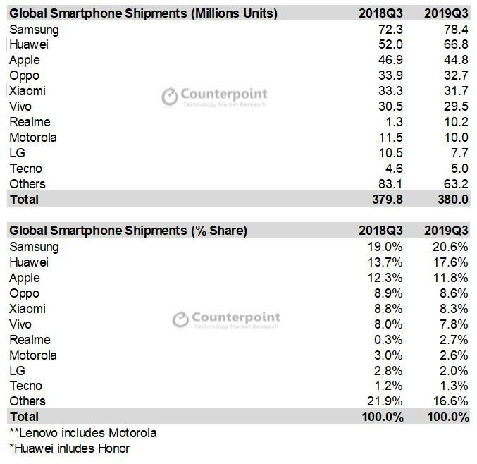 放眼全球智能手机市场,据Counterpoint Research的统计显示,在过去的第三季度,华为以6680万部的出货量和17.6%的市场份额位居第二位,相比之下,OPPO、vivo分别以3270万部(8.6%)、2950万部(7.8%)分列第四和第六位。