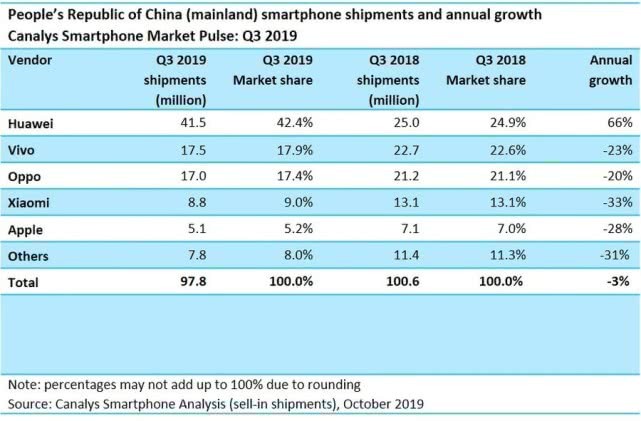据市场调研机构 Canalys 发布的中国和全球智能手机市场第三季度市场份额报告显示,华为在中国智能手机市场出货量整体下滑3%之时,竟同比大涨66%,在全球市场同比仅增长1%的情况下,华为同比增速也达到了29%,远超排名前5的其他手机厂商,让外界丝毫没有看到华为受美国“实体清单“的负面影响,更像是因祸得福的受益者。当然这个受益更多来自于意料之外,情理之中的中国市场销量的暴涨。