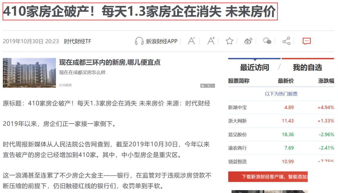 预测还包括:19年是中小房企倒闭潮,果不其然,今年截止当前房企倒闭400家的新闻在网上传得沸沸扬扬。