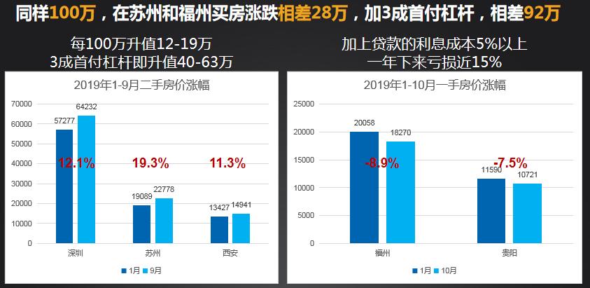 同样100万,在苏州买房,升值19万,而在福州买房却8万9,一来一去,就是28万的差距。如果加上3成首付的杠杆,那就是92万的差距。所以大家可以看到,哪怕是2019这个相比16、17年楼市要更平淡的1年,买房选对和选错城市,买房选对和选错时机,投资回报也是天差地别呀。